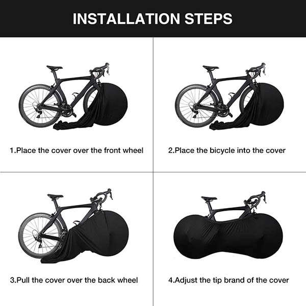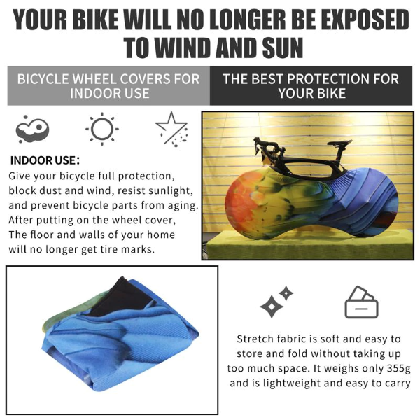 The materials used are elastic that conforms well with the shape of the bike. It reduces flapping and wind dragging noise and provides a tight, secure fit for short or long-term storage. It’s easy to put on and take off in less than a minute. The upper part of the wheel cover adopts high-elastic band binding to avoid slipping. Don’t worry about the installation. Thanks to its flexibility, it’s super easy. These bicycle wheel covers are suitable for tire sizes: 60-66cm and 69-73cm. It’s compatible with most types of bikes such as road bike, mountain bike, cruiser bike, city bike, etc.